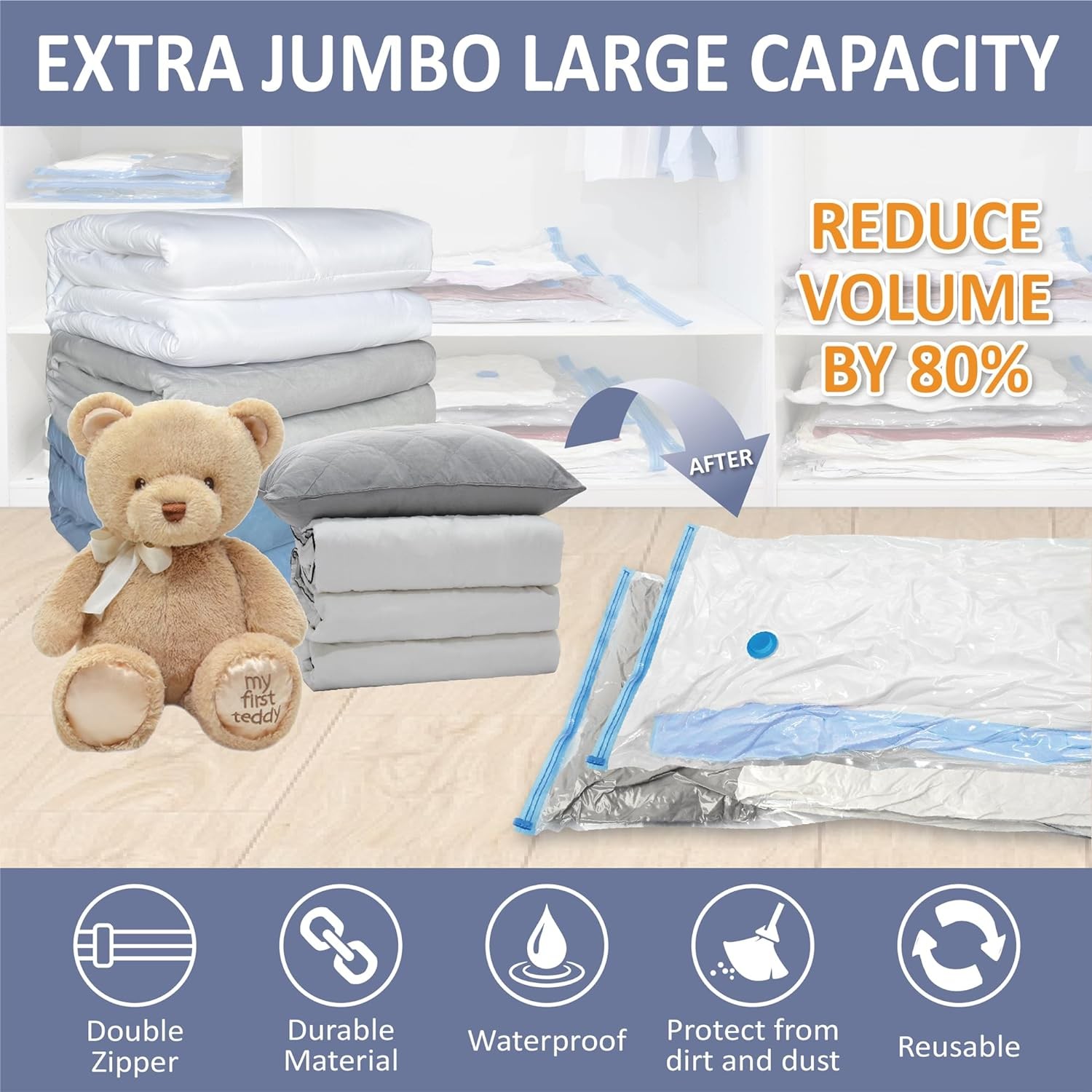 Come with extra large storage capacity, our jumbo vacuum storage bags is the go-to solution for high loads of seasonal cloth storage, house space saving organization, and travel necessities. Use our XXL space saver bags and store away variety size items including bedding, clothes, blankets, pillows, plush toys, and more. What's more: you can use our compression bags to reduce larger and fluffier items such as vests and winter coats to minimal sizes with ease. Our jumbo vacuum storage bags are tailored to pack hefty item such as big quilts, bedding or blankets.