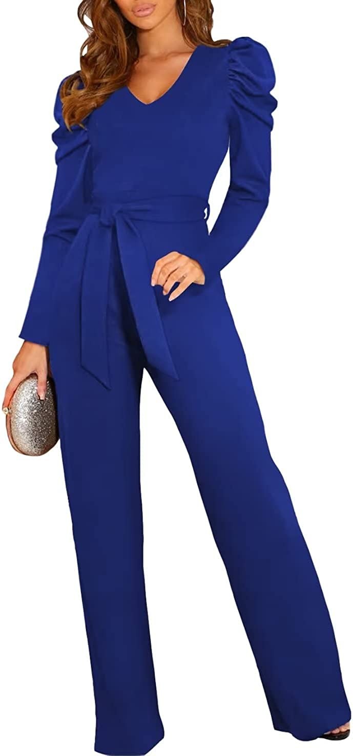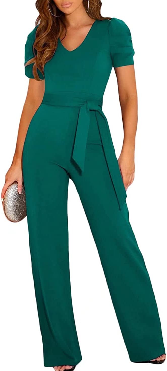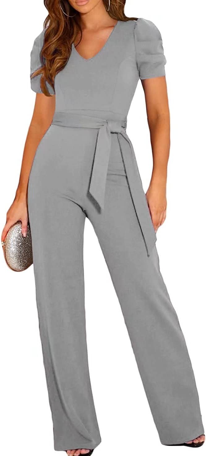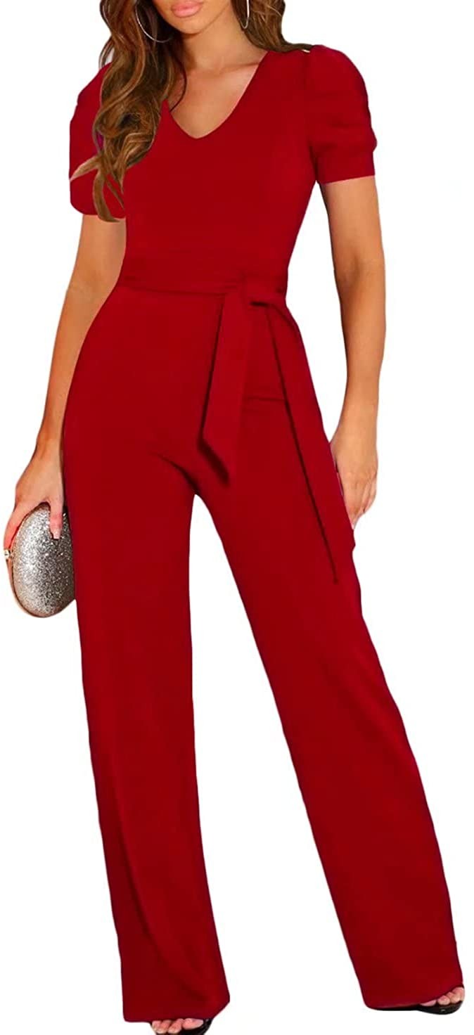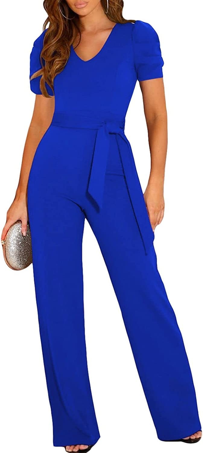 BLENCOT Womens Jumpsuit Short Sleeve Casual v Neck Belted Wide Leg Formal Romper